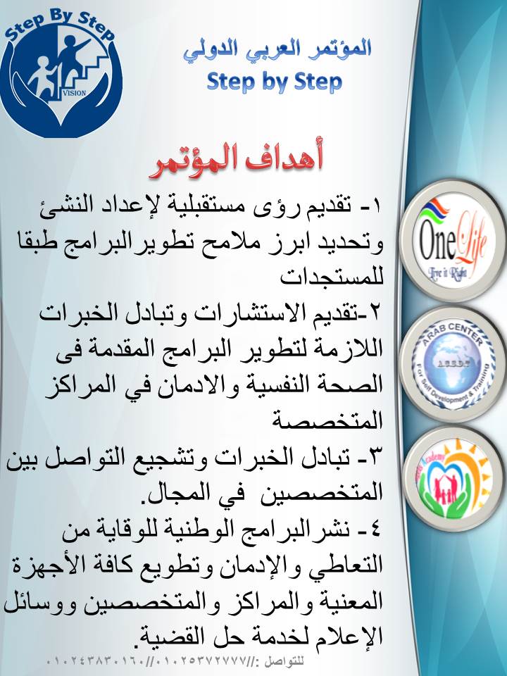 ومن خلال المؤتمر  الدولي الاول في مصر والشرق الاوسط الذي يأتي في اطار توعية الشعوب العربية والاسر في مجال الاهتمام بالنشئ  من خلال التربية السليمة والصحة والطب النفسي وعلاج الادمان ويأتي هذا المؤتمر تعزيزا بالتعاون بين عدة جهات محلية واقليمية ومدربين واخصائيين من كافة الدول العربية وجمهورية مصر العربية