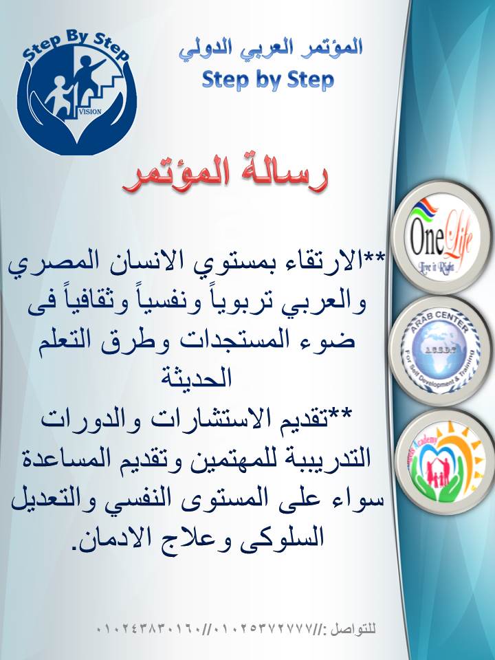 رسالة المؤتمرالارتقاء بمستوي الانسان المصري والعربي تربوياً ونفسياً وثقافياً فى ضوء المستجدات وطرق التعلم الحديثة **تقديم الاستشارات والدورات التدريببة للمهتمين وتقديم المساعدة سواء على المستوى النفسي والتعديل السلوكى وعلاج الادمان